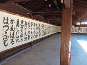 途中の回廊では今年も書初展が行われており、子どもたちの見事な作品を拝見させていただきました。
